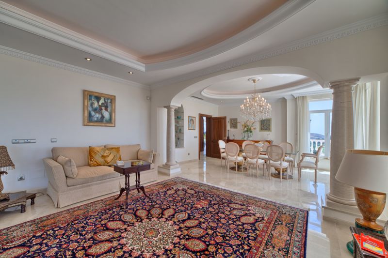 Stunning villa located in Marbella Club Golf Resort, famous for its championship golf course and Centre Hippique. The property was completed in 2002 and sits on a large plot with commanding views over the golf course, the Mediterranean, Gibraltar and towards Africa. The house is divided onto 3 levels with a lift that connects the 5 large bedrooms and bathrooms, guest toilet, kitchen and a separate dining room, several living areas, a bodega with dining and a separate service apartment. A large and heated swimming pool and a garage for 2 cars complete this stunning piece of property.